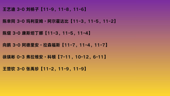 此阶段国乒相关6场单打比赛,全部都是对阵外协会选手,取得5胜1负的战绩。女单进展比较顺利,王艺迪、陈幸同和陈熠都直落三局完胜,没有遇到什么麻烦。男单向鹏、王楚钦皆顺利晋级,只有徐瑛彬被淘汰,且是连丢3局完败。